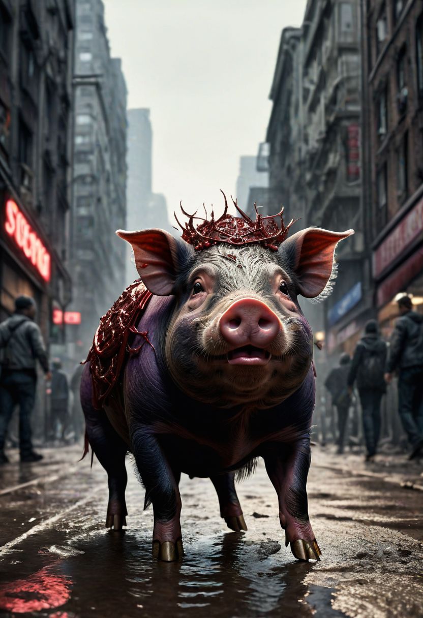 (( Photograph of (Evil and menacing but cute looking gothgirl, riding a large, muddy, duroc pig on a busy city sidewalk.) = (The evil and menacing but cute gothgirl is on the back of the duroc pig, this same menacing cute evil gothgirl is looking towards the viewer, the evil and menacing but cute gothgirl is making a circle or 'O' shape with her hand and sticking her tongue in the centre) + (the duroc pig is muddy, and bucking / the muddy duroc pig is jumping with an arched back) + (busy city sidewalk). )) BREAK ((Dark, melancholy, bleak, pyschologically unsettling, disturbing, upsetting, perfect quality, extremely detailed, intricately detailed background, cinematic, sepia with soft washes of maroon, midnight blue, and dark purple, splatters of red blood, perfect accuracy, award winning photograph)) BREAK ,((uhd, 8k photograph taken with Sony A7R III, 1/30sec at f/5.6, ISO 20,000, 12-24mm f/4 at 12mm, unusual low angles looking up, experimental lighting, evil shadowing)) BREAK ((inverted pentagram emblem present)), ng_deepnegative_v1_75t, epiCRealism, Ellis-RealismBoost