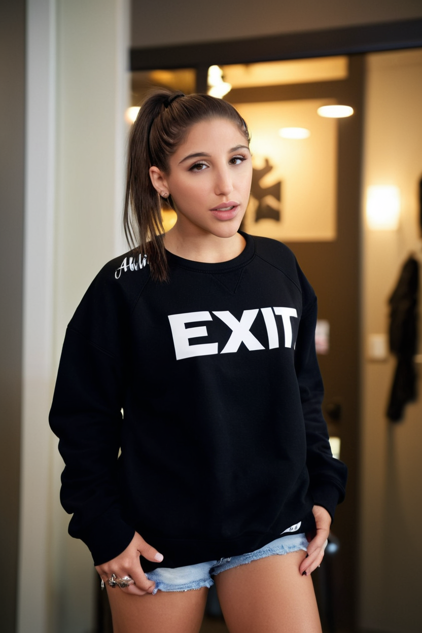 photo of (abella danger:1), a stylish woman, in a (exit interviews room), wearing a (oversized graphic sweatshirt with biker shorts), (front ponytail), shallow depth of field, vignette, high budget Hollywood film, bokeh, cinemascope, epic, gorgeous, film grain <lora:abellaDanger:1> . 35mm photograph, film, bokeh, professional, shot by sally mann, 4k, highly detailed