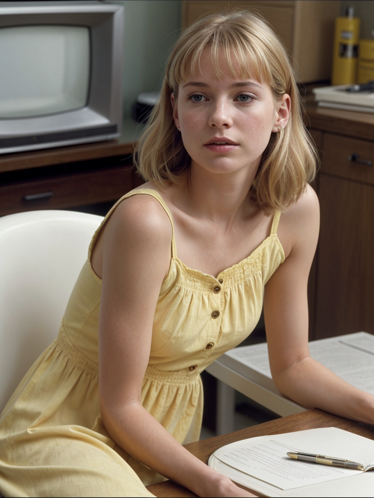 a woman sitting at a table talking on a cell phone, inspired by Winona Nelson, featured on reddit, screenshot from the 1983 film, beautiful blonde girl, wearing a sundress, young teen, shoulder pads, tv commercial, deep in thought, wearing a yellow dress, diary on her hand, 9 0 - s fashion, screencap, gwen stacy