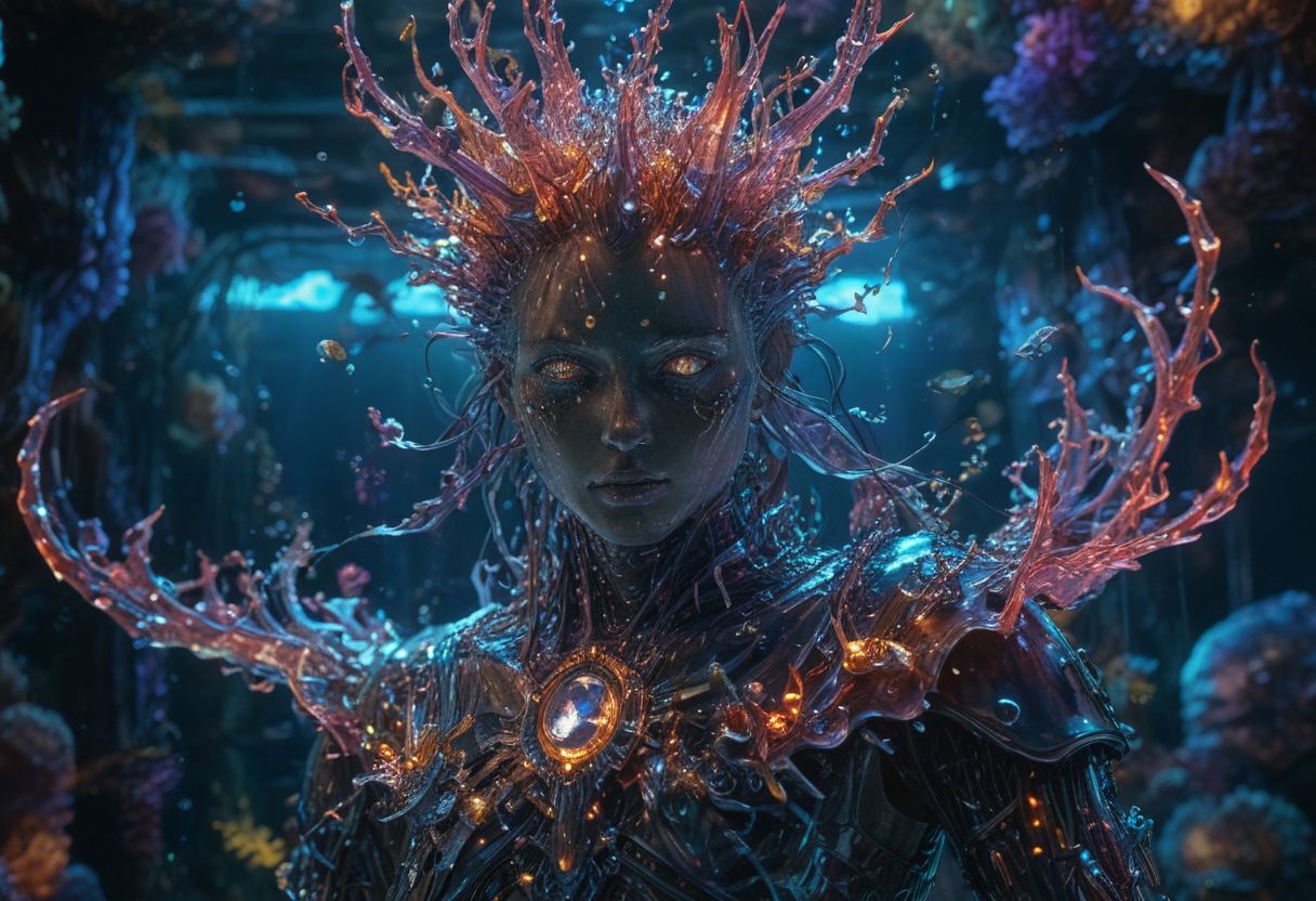 piercing light, (aesthetics:1.1), (low colors:1.2), BREAK, <lora:-_SDXL_-_holo_effect_V1.0:1>, hi-tech and futuristic holographic scanning, bioluminescence, optical fiber, masterpieces, octane rendering, unreal engine, intricate details, UHDR, 32, futuristic epic scene, super beautiful and realistic picture (( (fantastic landscape))) of ((underwater world)),fantastic sea creatures, mermaids, god neptune in (hdr), 8K quality, many living organisms, (fish), (coral), octopus, jellyfish, crustacean, etc. 1 ((research submarine)), wreck, ((1 heavy diver))