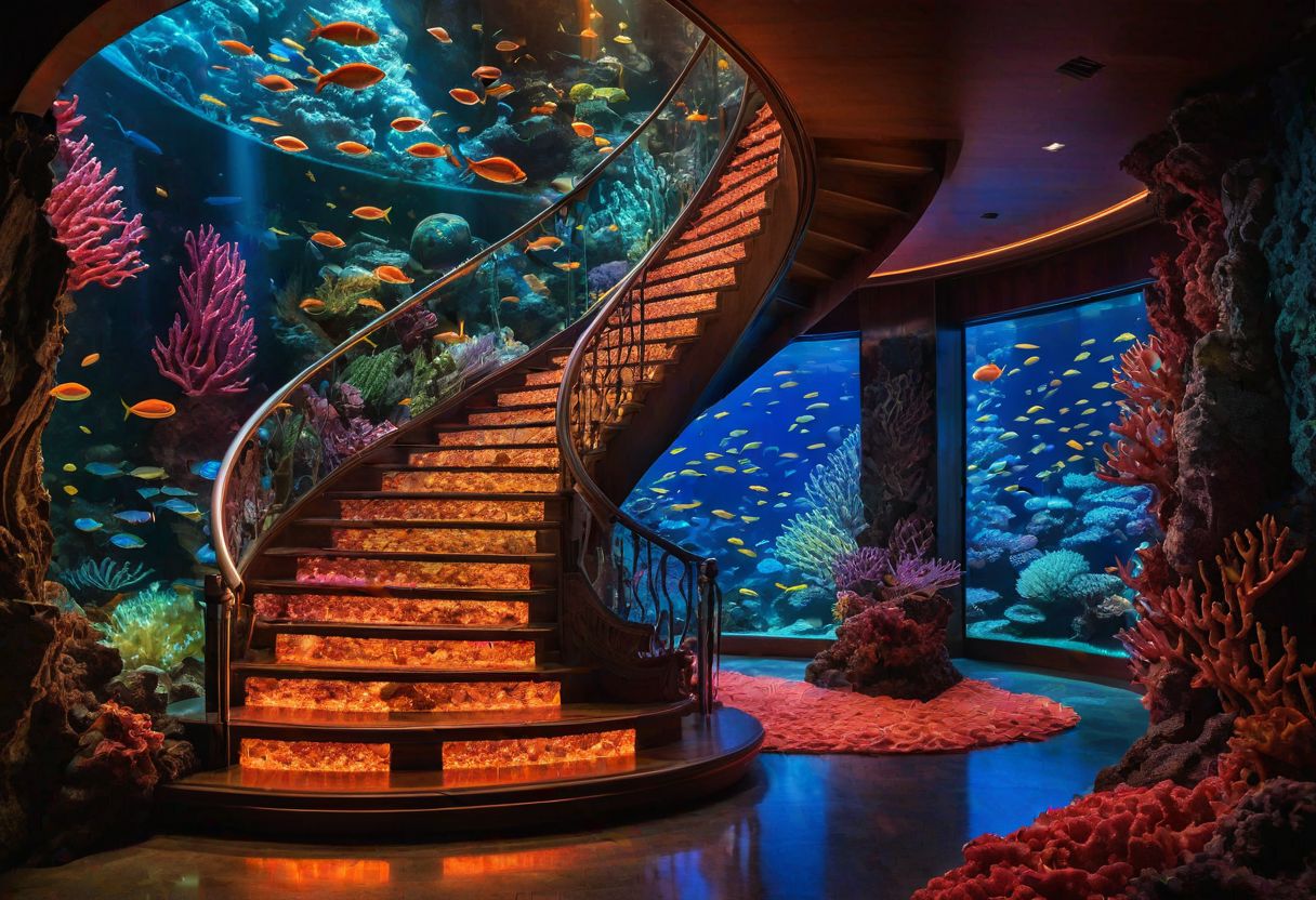 As you ascend the circular staircase carved from shimmering coral, the vibrant hues of the undersea kingdom come into view. Schools of iridescent fish dart between colorful coral formations, while bioluminescent creatures cast an ethereal glow upon the scene.