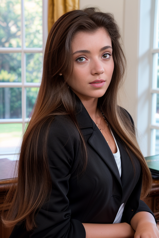 (RAW, analogue, Nikon Z 14mm ultra-wide angle lens, award-winning glamour photograph, ((best quality)), ((masterpiece)), ((realistic)), skin pores, subsurface scattering, radiant light rays, high-res, detailed facial features, high detail, sharp focus, smooth, aesthetic, extremely detailed, (extremely detailed eyes, extremely detailed iris), extremely detailed hair, extremely detailed skin, extremely detailed clothes, octane render, photorealistic, realistic, post-processing, max detail, realistic shadows, roughness, natural skin texture, real life, ultra-realistic, photorealism, photography, 8k UHD, photography, hdr, intricate, elegant, highly detailed, sharp focus, stunning, beautiful, gorgeous), (photorealistic), (realistic), mi454r4 in a high neck blouse, (black blazer1.2), standing in front of a desk, full body, brown hair with blonde highlights, brown eyes, indoors, oval office, white house, windows, upper body, morning, bright, photorealistic, realistic, detailed eyes, intricate face, high contrast, <lora:Mia_Sara_PMv1c_Lora:1.3>,