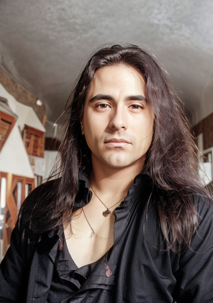 AndreMatosQuiron person, perfect body, purple hair, wearing a unique blend of majesty, exceptional attention to detail, luxurious fibers, a vibrant color palette of yellows, and rich, red oranges, inside winter cottage house, (look at viewer:1.1), (high quality face:1.1), (high detailed face skin:1.1), (realistic lighting:1.3), (beautiful moles and freckles:0.2), (film noise:1.4), (film grain:1.4), cinematic, realistic hands, realistic skin, <lyco:quiron_AndreMatos_v3_lycoris:0.8>