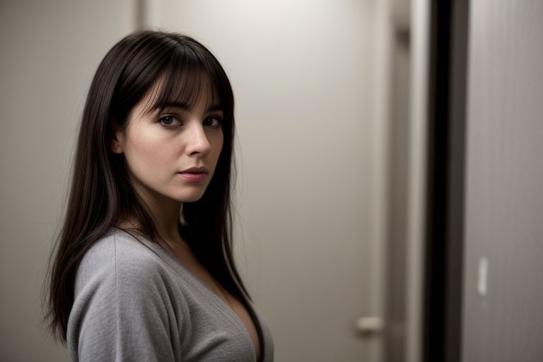 latina woman, 40 years old, pale skin, few wrinkles, cute face, puppy face, dark hair in a bun with short bangs, short height ,petite ,opened grey short bathrobe, huge boobs hanging out, seductive look, black eyeliner, flirty look, block hallway, no bra, sneaky shot, side view, model looking at the camera seductive, model fits in the shot