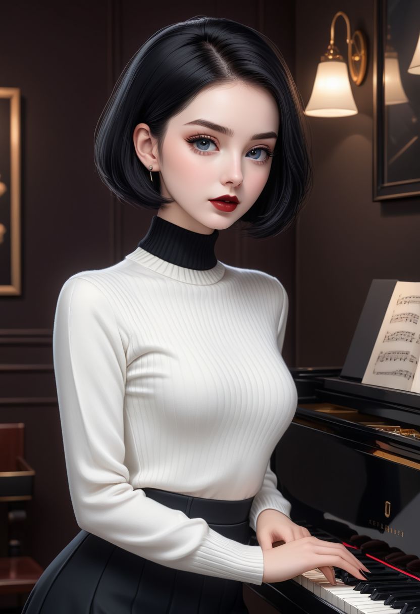 (score_9, score_8_up, score_8:1.2), (1girl, solo, masterpiece, 8k, HDR,), a beautiful and alluring young woman, (pale white skin:1.2), blushing, (black short hair:1.2), (middle-part hair:1.2), light blue eyes, black lipstick, dark eyeliner, chain choker, small breasts, flat chest, tight waist, slim feminine body, small hips, round ass, cute, eyelashes, character concept art of a beautiful woman stading on top of a piano, dark tight turtleneck, dark tight skirt, extremely sexy, seductive, dark music room.