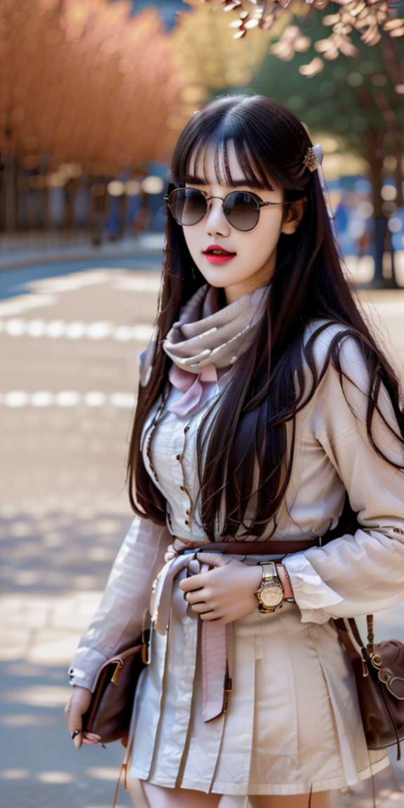 masterpiece,highres, highest quality,intricate detail,best texture,realistic,8k,soft light,perfect shadow, sunny,modern city,crowding falling leaf, portrait,erjie,1girl,high school uniform,alternative hair,cute pink lips,Short scarf, cowboy boot, big gold necklace,famous watch, smoking the cigar,light sunglasses,thumb up,walking,Luxury, weapons on waist,street shot,