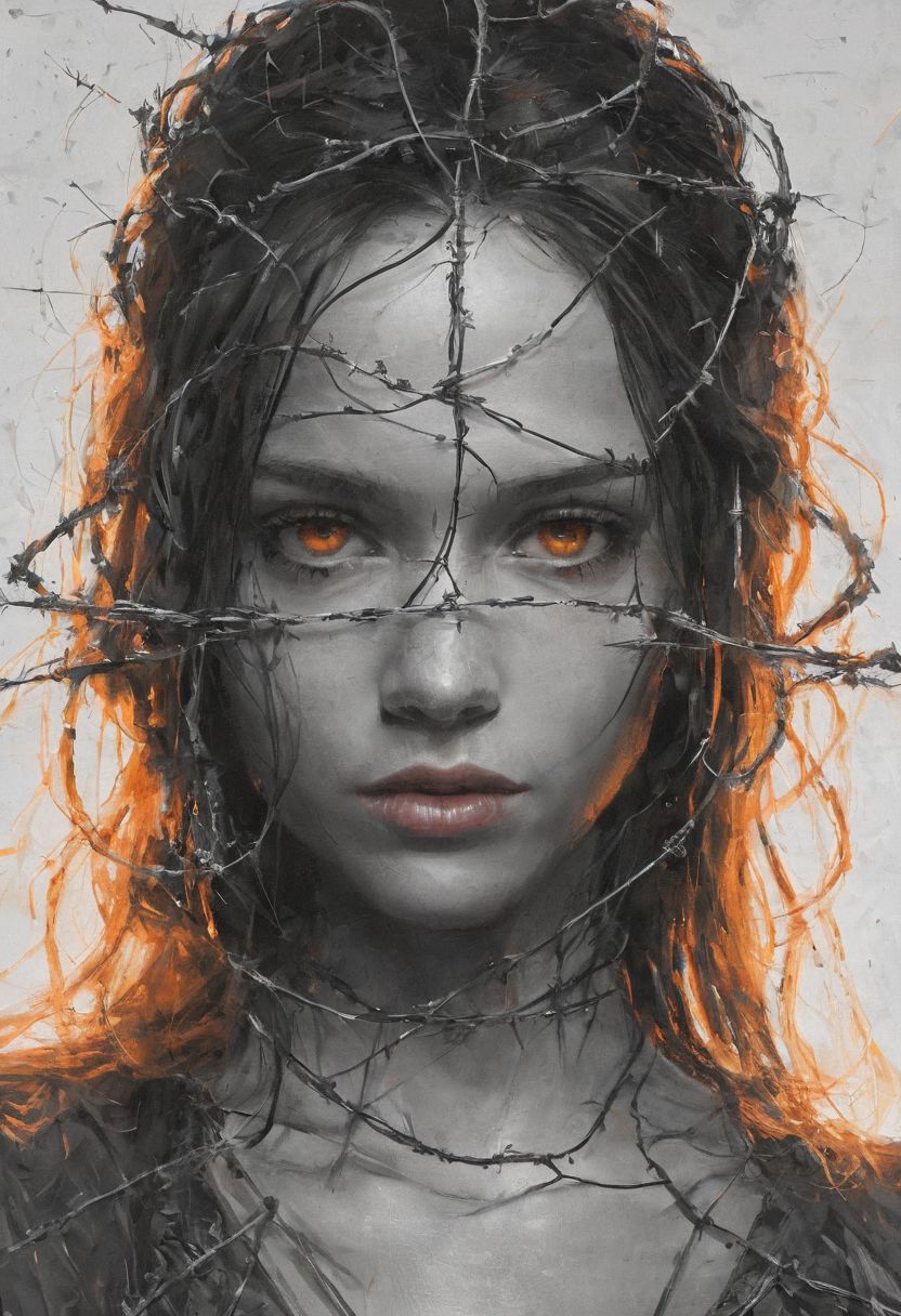 n image of a female with crown of barbed wire and a glow orange, in the style of speedpainting, dark white and dark gray, character studies, dom qwek, nihilcore, wlop, iconic Wide range of colors., Dramatic,Dynamic,Cinematic,Sharp details Insane quality. Insane resolution. Insane details. Masterpiece. 32k resolution. <lora:add-detail-xl:0.95> <lora:dvr-lnds-sdxl:0.3> dvr-lnds-sdxl <lora:MJ52:0.25> <lora:ral-apoctvisn-sdxl:0.3> ral-apoctvisn <lora:zavy-cntrst-sdxl:0.35> dark, chiaroscuro, low-key <lora:zavy-rmlght-sdxl:0.41> zavy-rmlght <lora:SDXLFaeTastic2400:0.225>