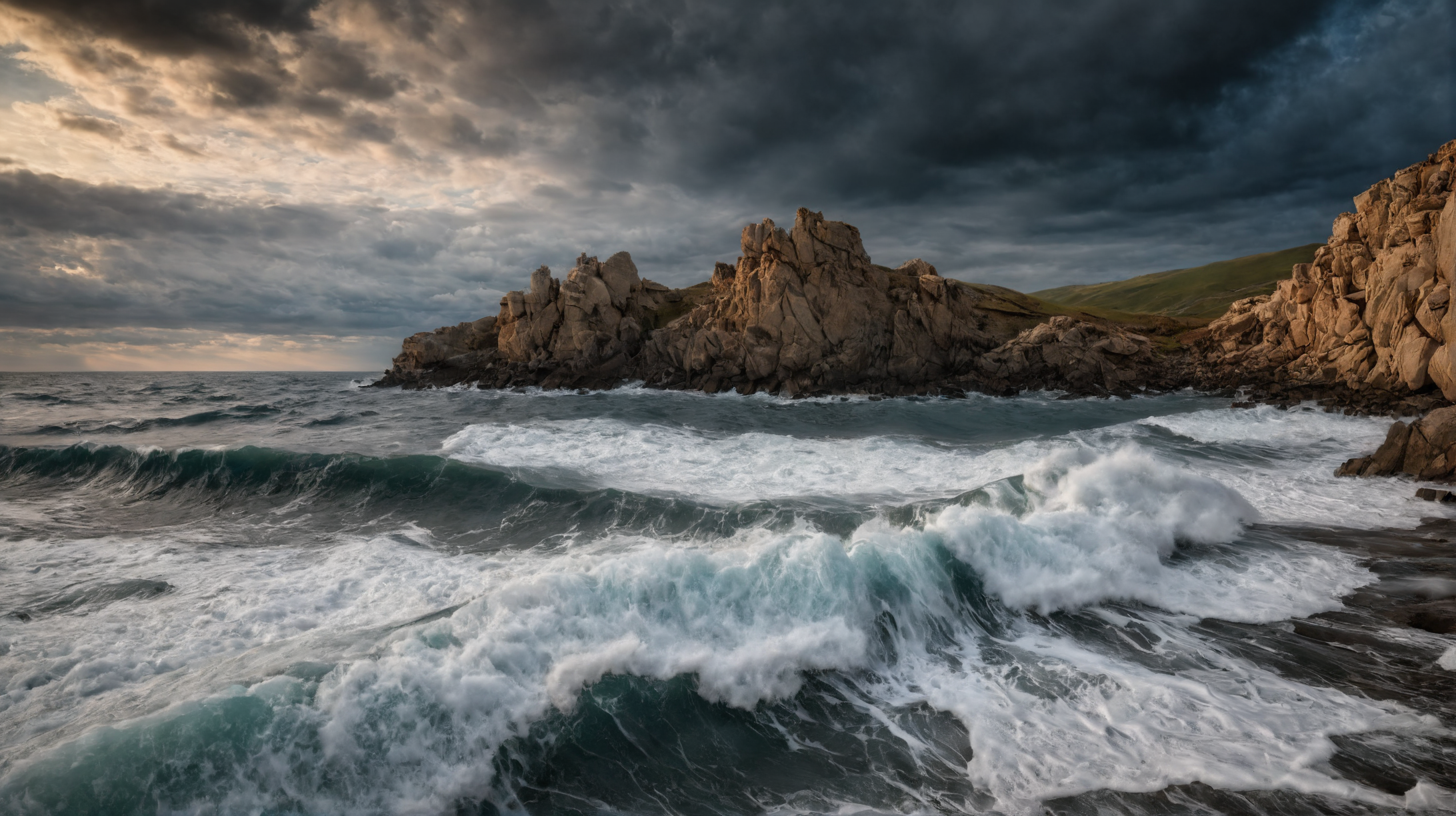 CINEMATIC SHOT,professional photo by Caravaggio of wild nature,Sachalin,cliffs,rock formations,sea waves,rough sea,dramatic clouds,rule of thirds,view from surface,strong wave,(by Christopher Nolan:1.4),F11,(DOF, Cinematic Color grading, intricate, hyper realistic, detailed, flickr, cinematic lighting),<lora:Wild_nature_XL:1>,