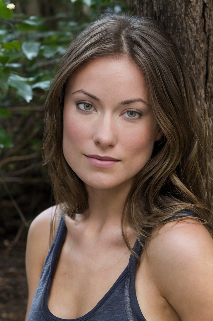 a picture of owilde15 woman, brunette,detailed skin, surface scattering, bokeh, skin pores, camp,wearing a tank top,runner, looking at viewer ,(subtle smile:0.5), detailed face, <lora:owilde15:1>