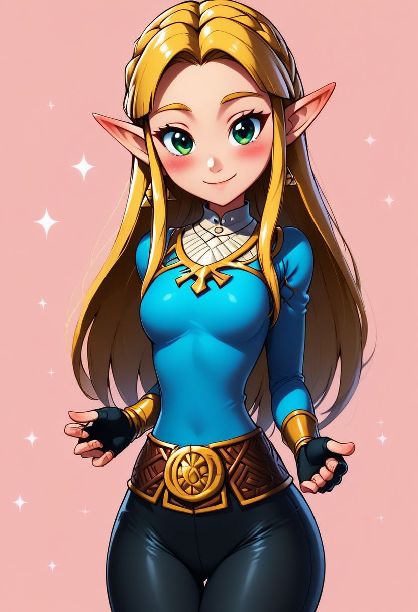 medium breasts, cute, eyelashes , princess zelda, long hair, pointy ears, blue shirt, long sleeves, fingerless gloves, black gloves, black pants, tight pants, green eyes, solo, looking at viewer, smile, blush,,