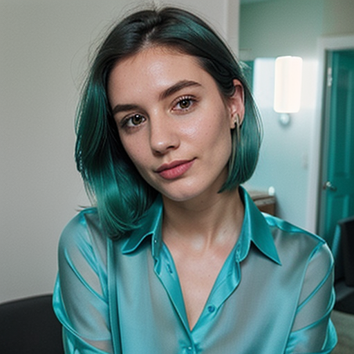 Instagram photo, a woman, (teal hair: 1.2), cleavage, glowing skin, (smile: 0.4), hard shadow, white shirt