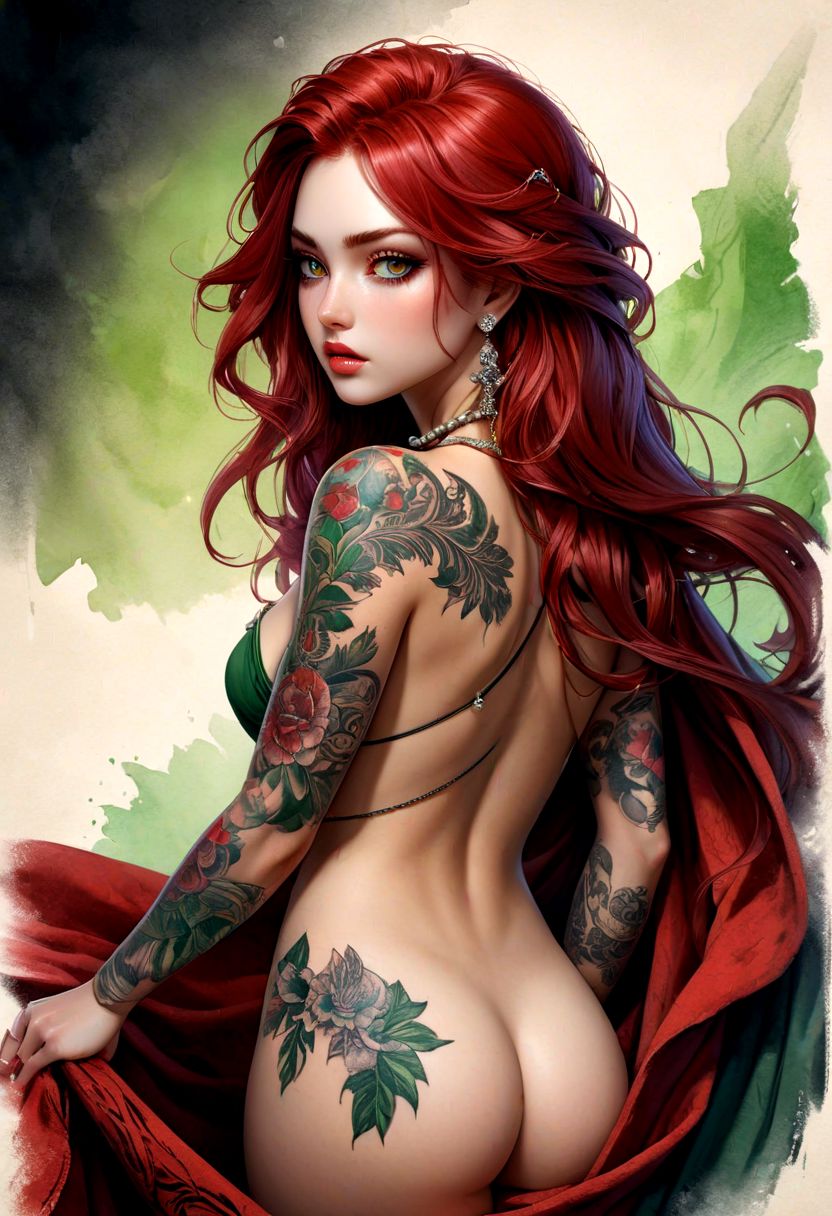 masterpiece,HDR,trending on artstation,sharp focus,high contrast,8K,Hyper-detailed,intricate details,cinematic lighting, <lora:add-detail-xl:1> perfect eyes, crystal clear eyes, nsfw, hyper maximalist , British theme, dusty hair, Britain flag, illustration pessimistic utopian brutalism style of an old parchment, black ink and watercolor on parchment dark moody, young whore goddess in a red falling blanket posing for a picture with her back turned to the camera, half exposing her body, bare back, bare shoulders (tattoos:1.5), long flowing (red hair:1.5), pearl necklace, very beautiful face, green eyes, puffy lips, looking at viewer, looking back, masterpiece, best quality, hyper detailed, figurative art, professional poster art, trending on ArtStation, a sculpture <lora:ParchartXL-2.0:1>