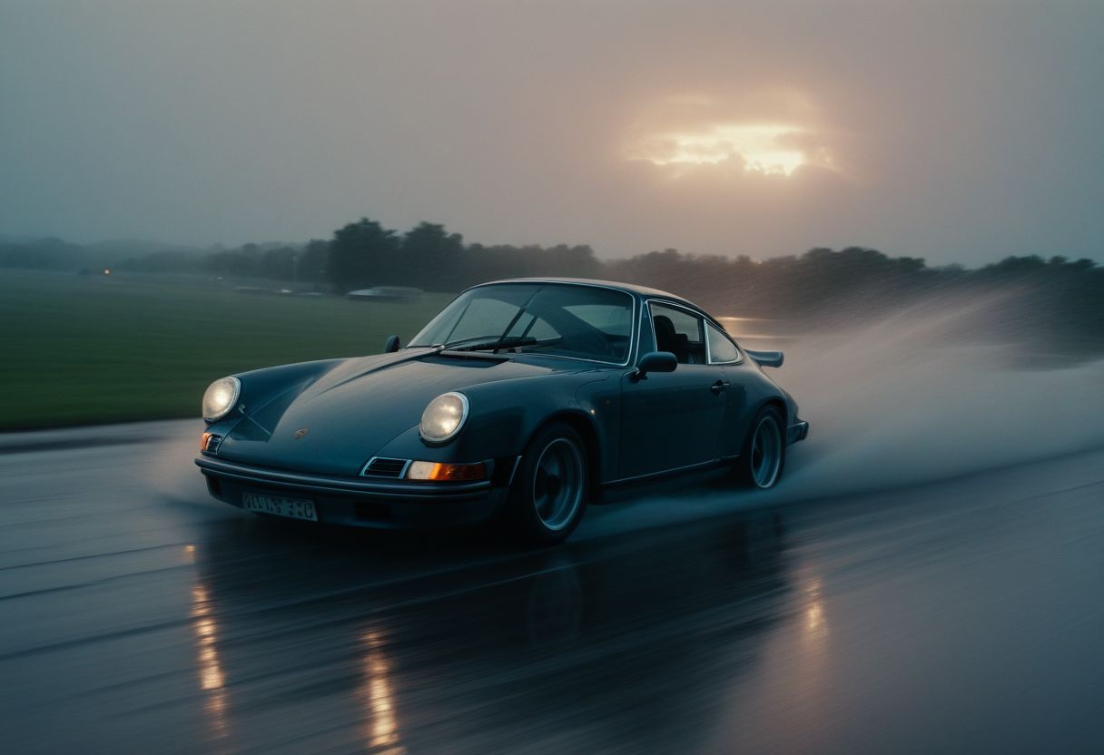 cinematic photo of a fast moving drifting classic Porsche 911 at sunrise, motion blur, moving tires, downpour, thunderstorm, heavy rain, Movie Still, Film Still, Cinematic, Cinematic Shot, Cinematic Lighting
