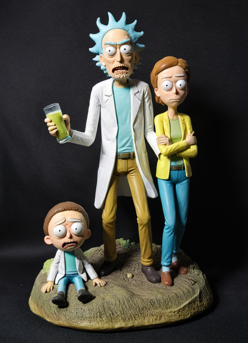 ceramic sculpture of rick and (morty:1.3), on the table, dark fabric background, 8k, F2.8, RAW Photo, ultra detailed, real life, M1n14tur3, <lora:M1n14tur3_XL:1> <lora:xl_more_art-full_v1:0.8>