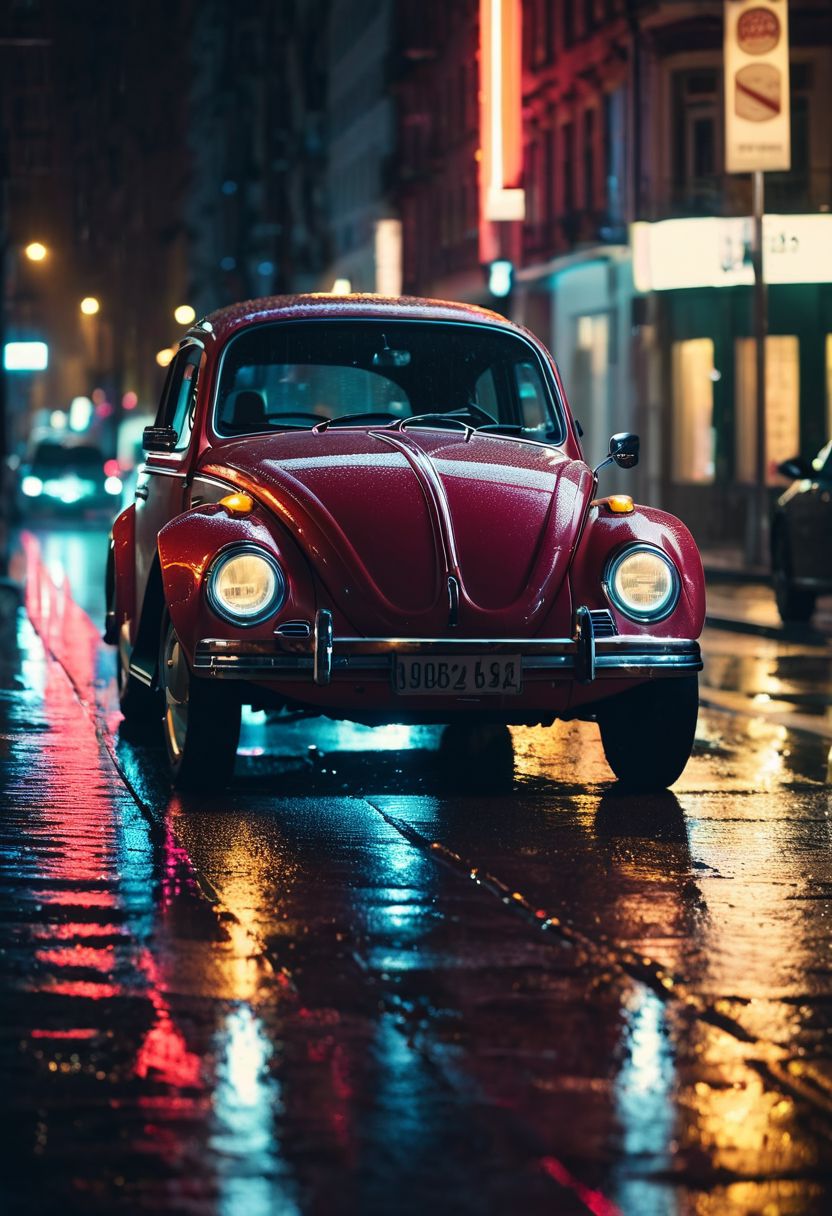 cinematic still, a volkswagen beetle driving on a city street at night, neon light reflecting on the wet streets, headlights illuminating the scene and casting a warm glow on the wet pavement <lora:MoreArtFull_v1:1>, emotional, harmonious, vignette, highly detailed, high budget, bokeh effect, cinemascope, moody, epic, gorgeous, film grain, grainy