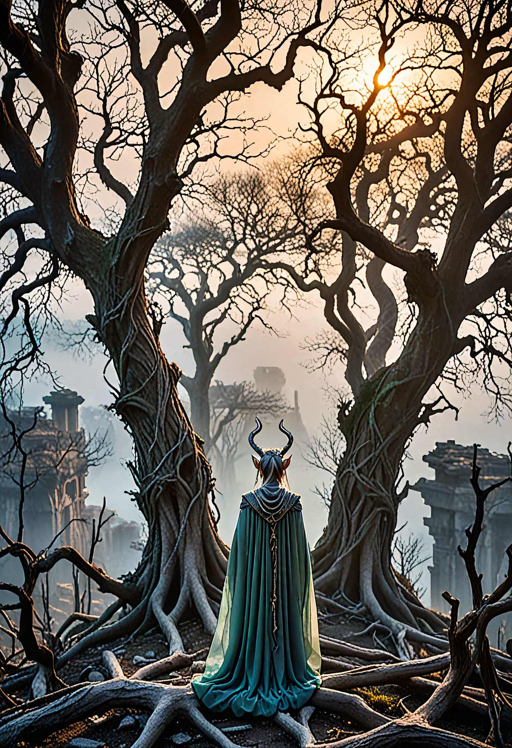Dystopian style wide shot, elven mage at dawn, from above, extremely oversized translucent ears, thick iridescent mist, ancient ruins, twisted gnarled trees, eerie, otherworldly energy, <lora:Hyper-SDXL-8steps-lora:1.0> . Bleak, post-apocalyptic, somber, dramatic, highly detailed