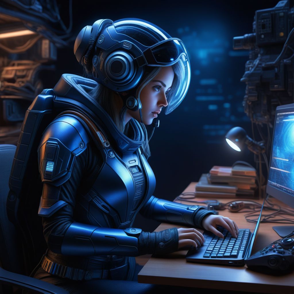Ultra realistic color pencil drawing of a cyber scavenger woman, trying to sell gadgets that she have collected. Wearing scrappy clothes on a desert planet. BREAK Deep dark intense midnight blue misty background, Dark theme, dynamic lighting, (soft shadows), (soft focus), (photo realistic), extreme details, uhd, 8k