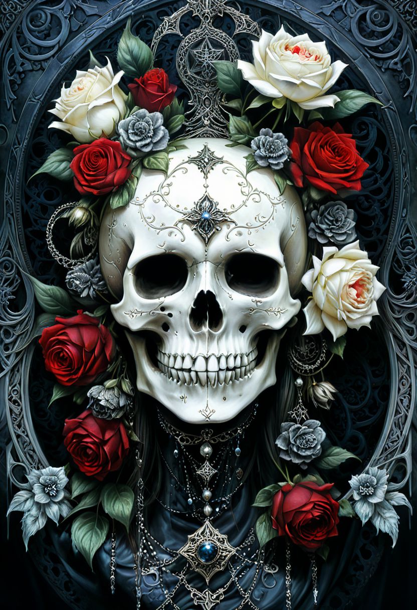 Horror art by luis royo, Stephanie Rew Bella Kotak, h. P. Lovecraft, "Ornament, Wallpaper, gothic, skull, still life, flowers, dark, deep colors, elegant, royal, hyperdetailed, insanely intricate, delicate, beautiful, macabre, biopunk, dynamic, hyperdetailed, Psychedelic ultra highly detailed, detailed digital painting, highly detailed, intricated, intricated pose, clarity, high quality<lora:xl_more_art-full_v1:0.3>