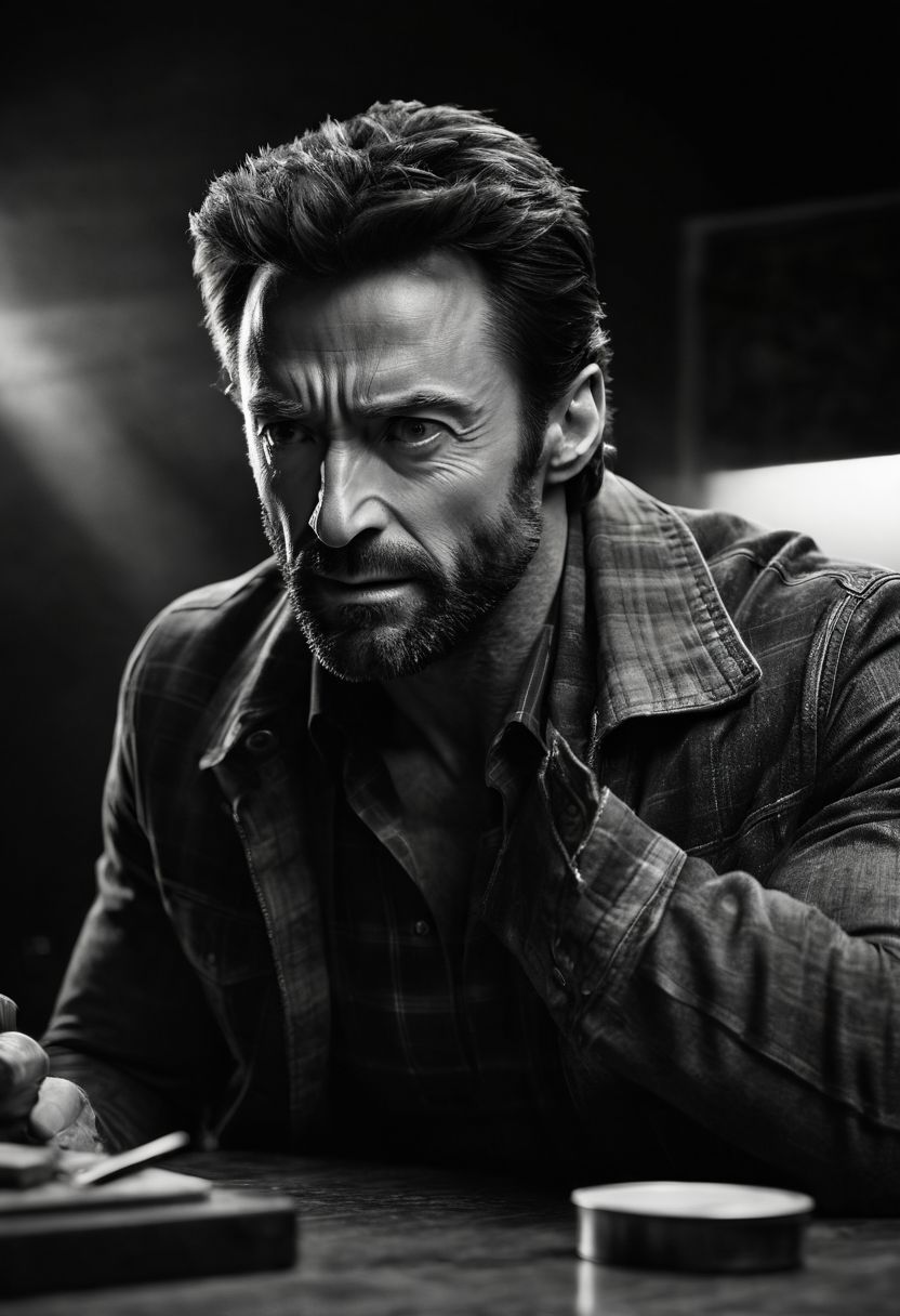 highly detailed and hyper realistic b&w photo of ( Hugh Jackman as Wolverine ) (eyes Catch-lights), ,( black background,) (smoking cigarette) ,thick flannel jacket, ,tumbler of whiskey on table shadow falling on eyes, , b&w , (lighting: dramatic) , (lighting: high key) shot on Polaroid film, cinematic still frame, film grain, shallow depth of field, , crouched, faded colors, vintage, motion blur, , deep shadows, highly detailed and hyper realistic