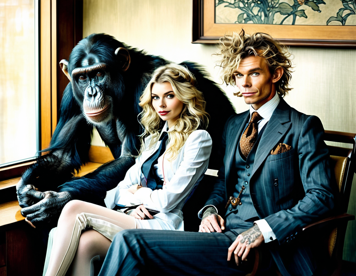 (Arthur Rackham:1.3), portrait, 25 y.o gorgeous blonde woman sitting next to a chimp in a business suit, a doctors office, (best quality:1.2), (extremely detailed:1.3)