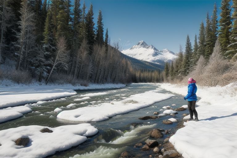 Best quality, tundra, 1girl, standing river bank, standing, mountain, snow, river, trees