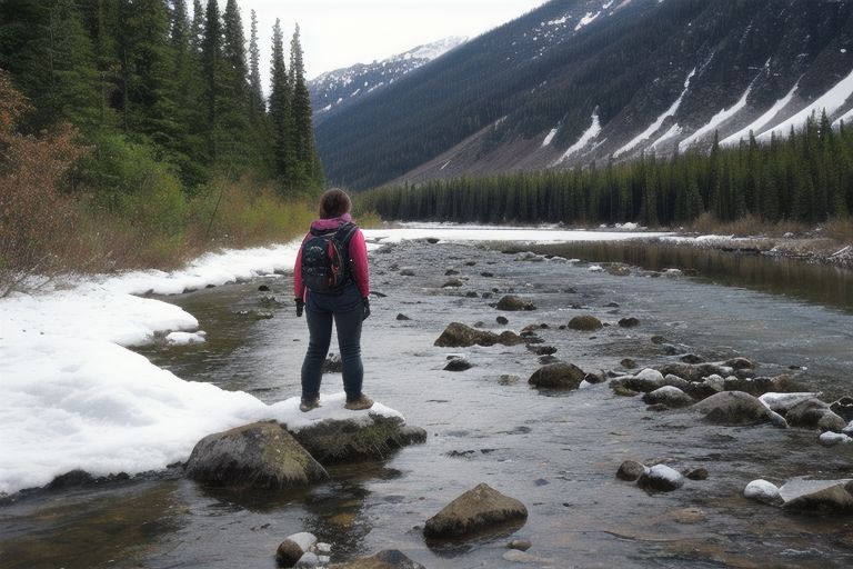 Best quality, tundra, 1girl, standing river bank, standing, mountain, snow, river, trees