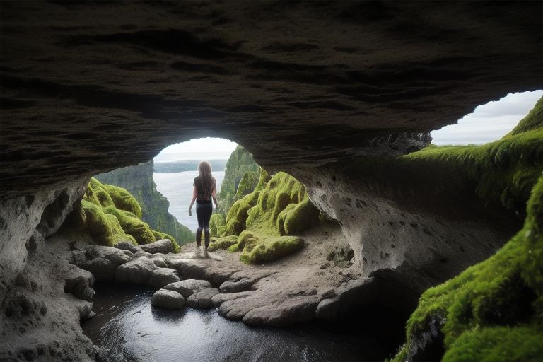 Best quality, 1girl, cave, cliff, standing on cliff, standing, wave, moss