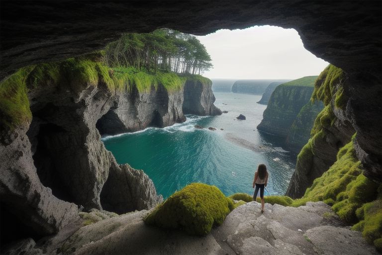 Best quality, 1girl, cave, cliff, standing on cliff, standing, wave, moss