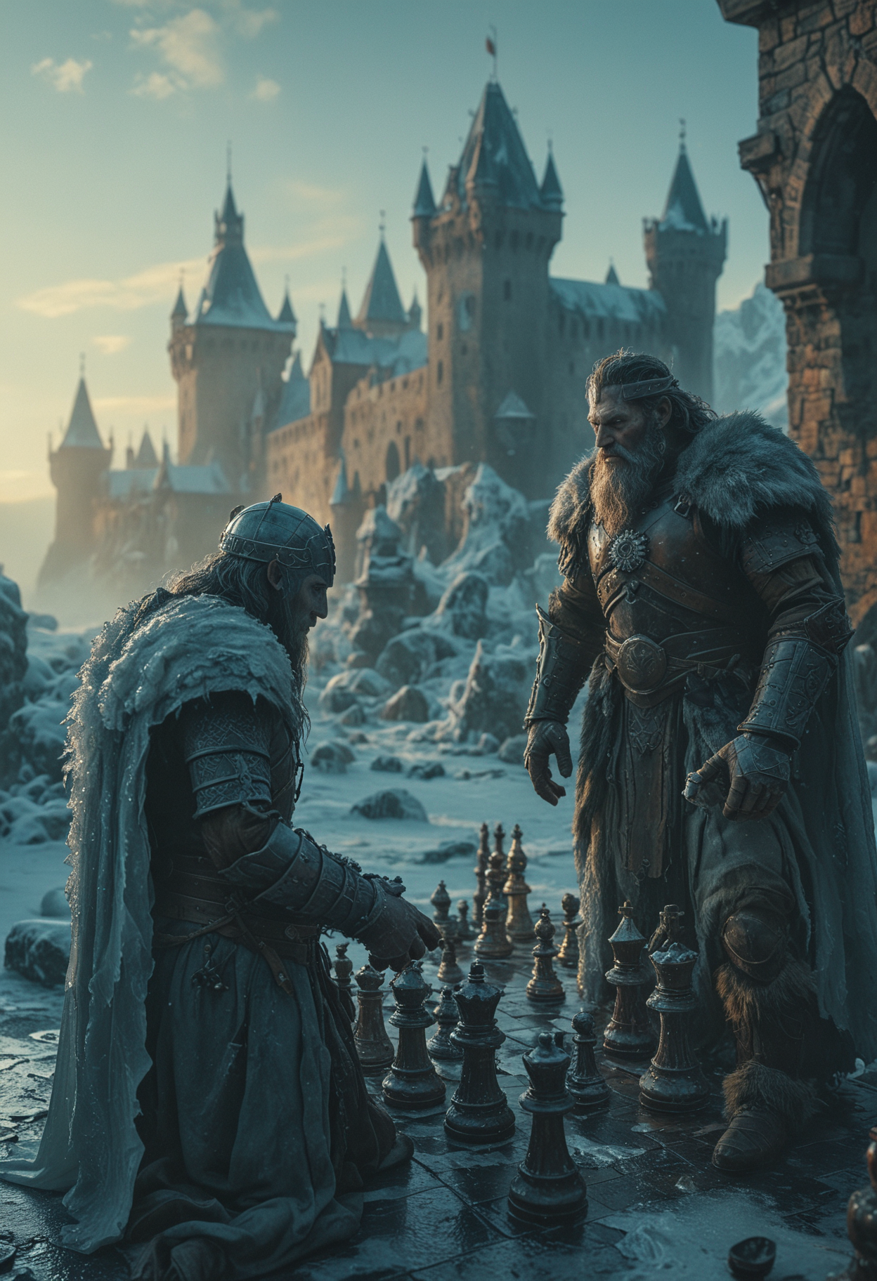 Ice giants playing chess, aurora sky, small medieval city background, masterpiece, fantasy, digital art, highly detailed, overall detail, atmospheric lighting, Awash in a haze of light leaks reminiscent of film photography, awesome background, highly detailed styling, studio photo, intricate details, highly detailed, cinematic, <lora:MJ52:0.6>,