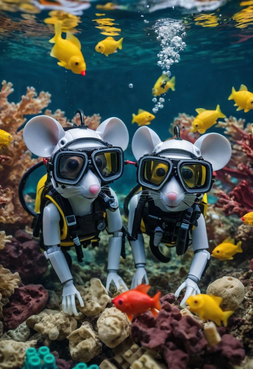 Professional photo of a couple of mice scuba diving , Realistic, colorful fish made out of Legos, beautiful, wonderful, cinematic, whiskers, mask, air regulator, fins, swimming underwater, ocean