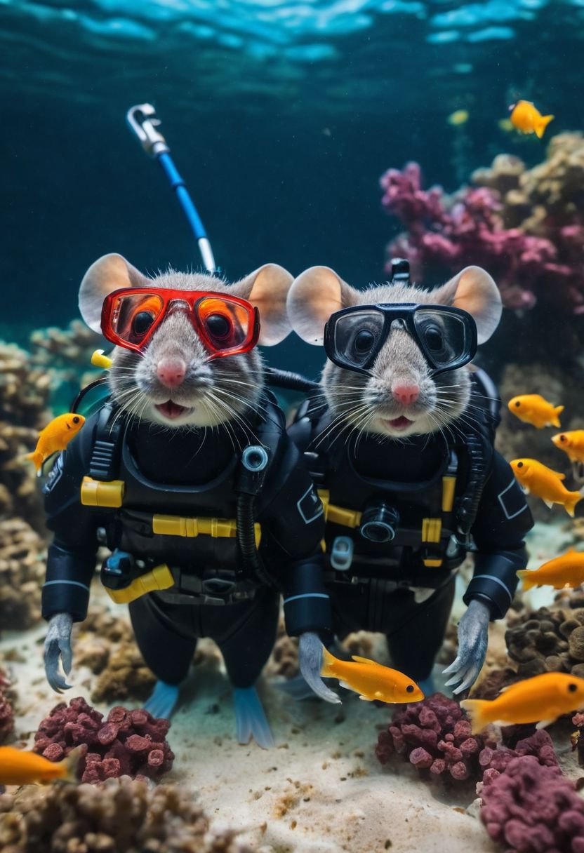 Professional photo of a couple of mice scuba diving , Realistic, colorful fish made out of Legos, beautiful, wonderful, cinematic, whiskers, mask, air regulator, fins, swimming underwater, ocean