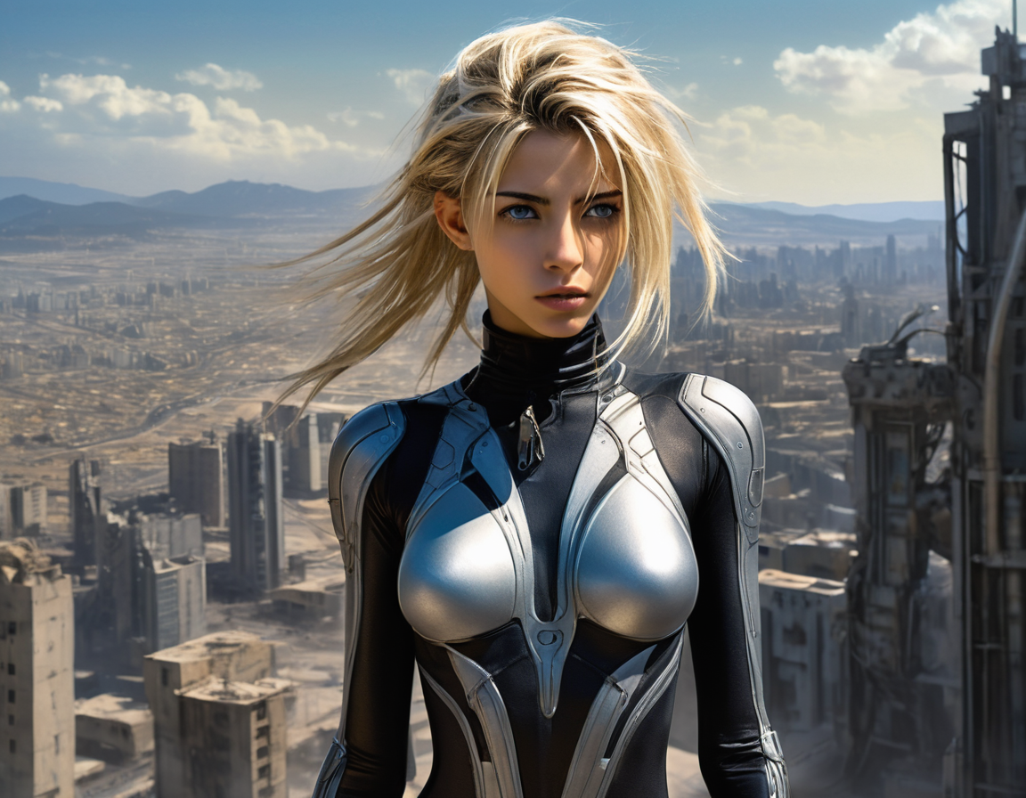 A captivating digital art by Enki Bilal; showing a beautiful alinaxl3, gazing into the distance atop a desolate futuristic cityscape, featuring sharp cheekbones, with blonde hair flowing in the wind, and clad in a sleek bodysuit with cybernetic enhancements..
