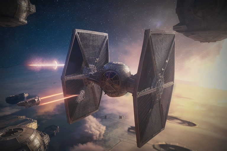 analog gloomy aerial photo of a (Tie Fighter, <lora:t13f1ght3r:1>), ((nighttime)), (flying in a space battle), outer space, planet orbit, (explosions in the background), (lasers), High Detail, Sharp focus, (photorealism), realistic, best quality, 8k, award winning, dramatic lighting, epic, cinematic, masterpiece, rim light, (action movie), war, depth of field, dutch angle,