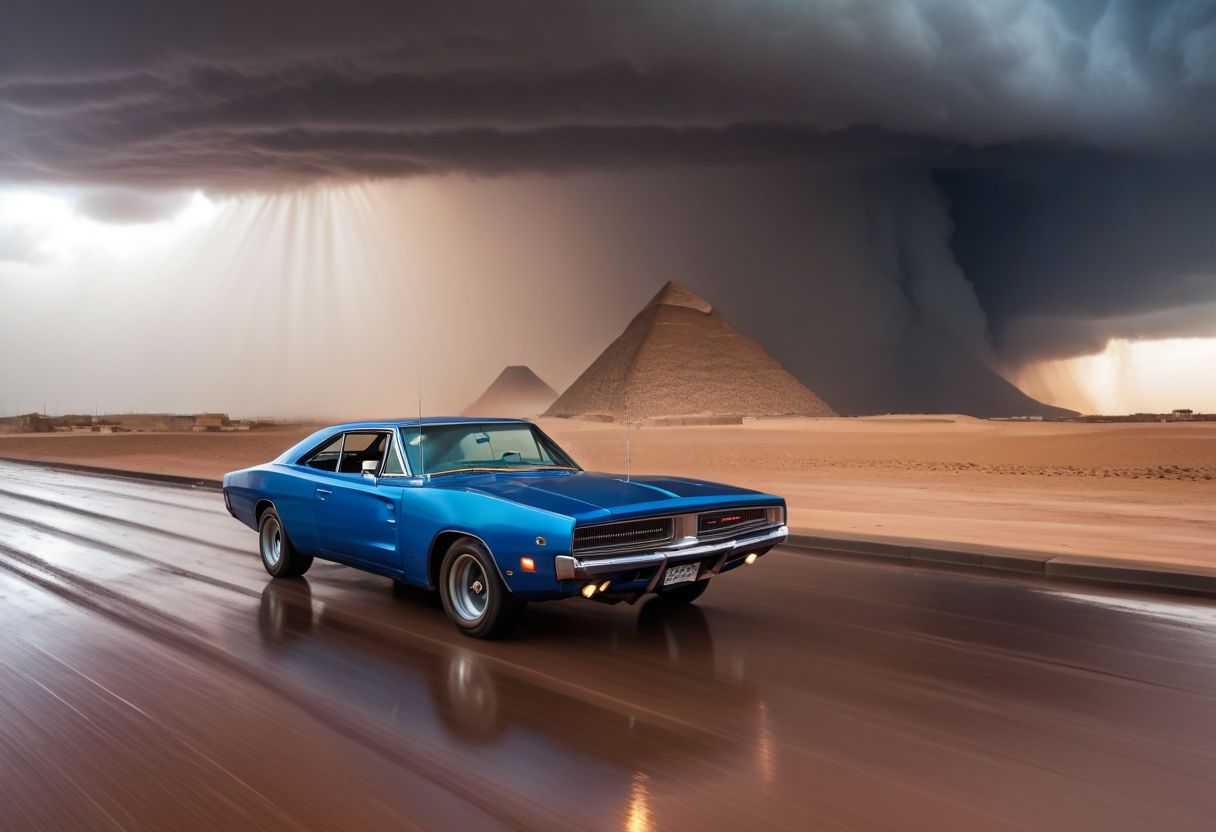 cinematic photo of dodge Charger 1968 and the [[[three pyramids of Giza]]] in the background, charm, highly detailed car, Professional lighting, rain, wet road, 8K, rays of sun flow beyond heavy clouds, HDR, Fast & Furious movie, motion blur, moving tires, Cinematic Shot, Cinematic Lighting, amazing world, pure perfection, Need For Speed, wide angle exterior background