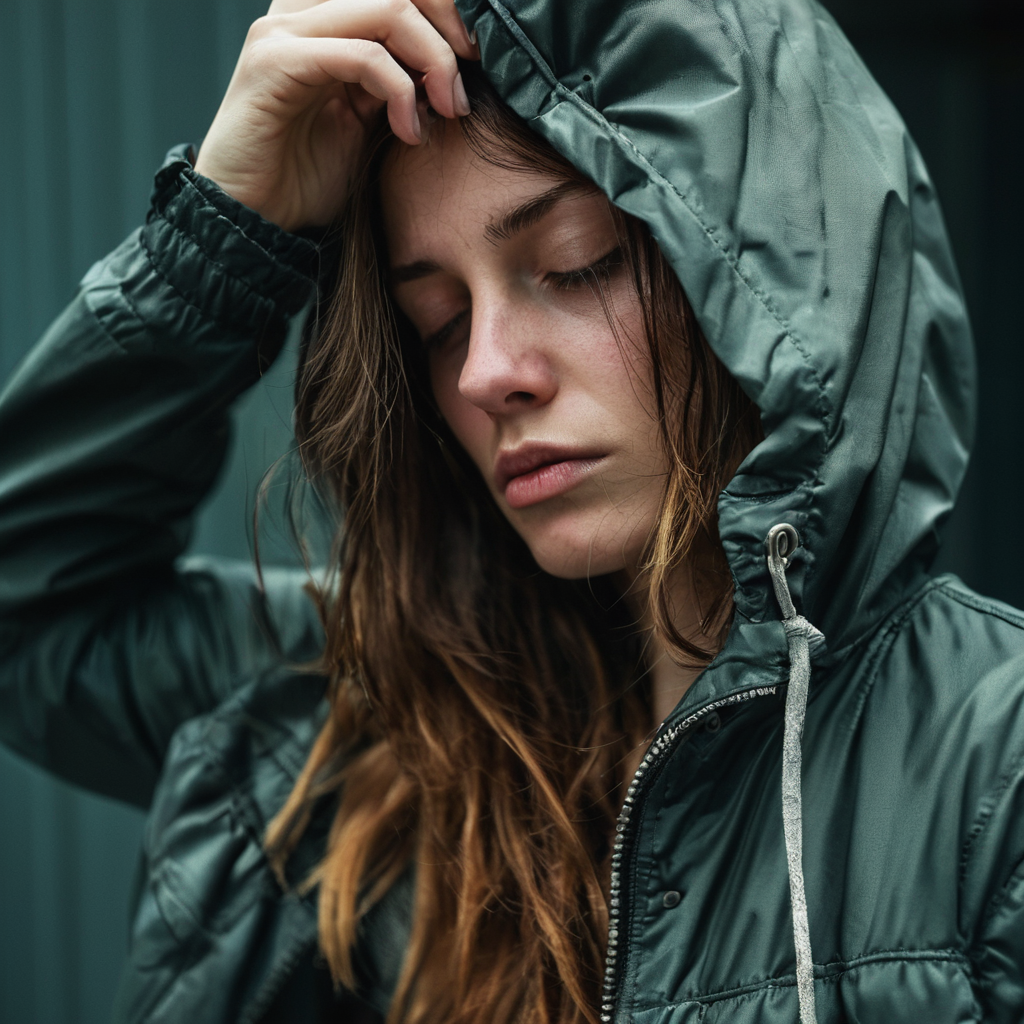 photography, cinematic, an image of a woman looking down at the camera and a jacket over her head, highly detailed <lora:style_lora_dadaptadam_realis-step00002600:0.6>