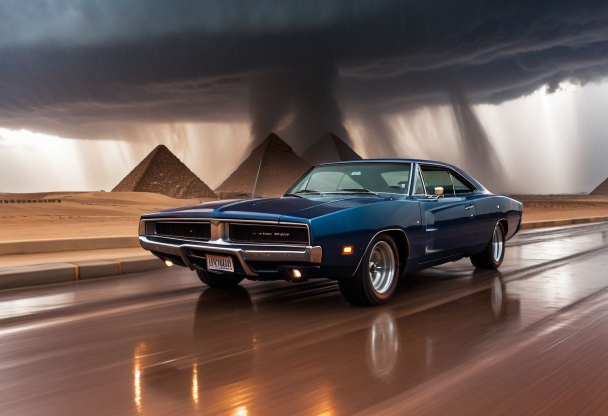 cinematic photo of dodge Charger 1968 and the [[[three pyramids of Giza]]] in the background, charm, highly detailed car, Professional lighting, rain, wet road, 8K, rays of sun flow beyond heavy clouds, HDR, Fast & Furious movie, motion blur, moving tires, Cinematic Shot, Cinematic Lighting, amazing world, pure perfection, Need For Speed, wide angle exterior background