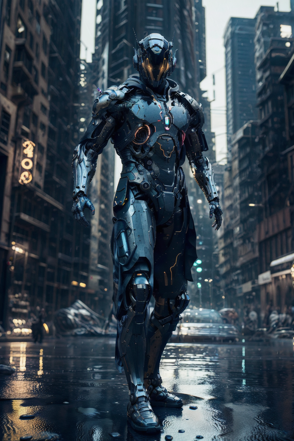 (full body, (dynamic pose)), muscular male android humanoid, flowing dark thick cloth cloak, dark metallic armour, neon parts, advanced civilization, towering structures, skyscrapers, immersed beautiful lights, fully detailed environment, (rim lighting, studio lighting, rain, distant moonlight, night, bloom), (cinematic, best quality, masterpiece, ultra HD textures, highly detailed, hyper-realistic, intricate detail, 8k, photorealistic, concept art, matte painting, autodesk maya, vray render, ray tracing, hdr), (dslr, full frame, 16mm focal length, f/8 aperture, dynamic perspective, dynamic angle, wide field of view, deep depth of field, (zoom out:1.2)) <lora:MISC-epi_noiseoffset2:0.3> <lora:urbansamuraiv0.14:0.4>techwear,urbansamurai <lora:3dCGStyleRealistic:0.2> <lora:lou:0.2>3d, realistic <lora:cyberhelmetv0.7:0.7> cyborg in a cyberhelmet head <hypernet:dr0ne_1:0.15> <hypernet:sxzBloom_sxzBloom:0.3><hypernet:LuisapSciFiHard_v1:0.1>