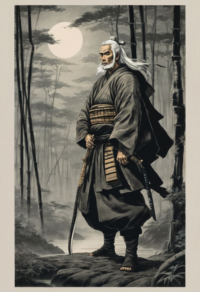 A stoic samurai warrior with flowing white hair and a katana resting on his shoulder, standing amidst a bamboo forest bathed in moonlight.