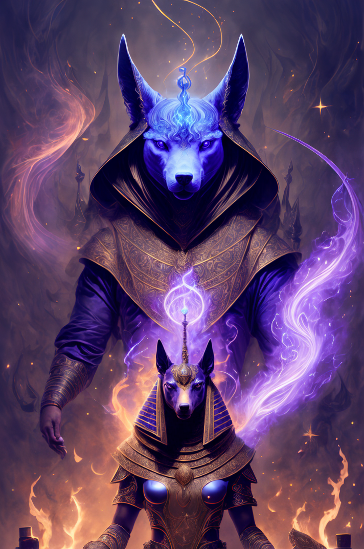 1girl, portrait of female godanubis with jackal head in front altar, swirl of fire, aura, magic, sparks, magic astral, ornate <lora:ARWgodanubis:1> <lora:kVoidEnergy:1> <lora:add_detail:1>