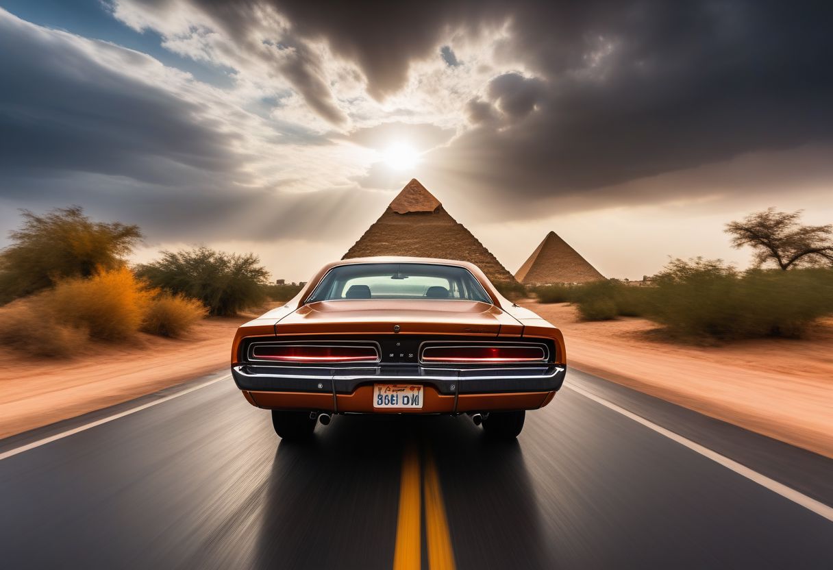cinematic photo of dodge Charger 1968, magnificent three pyramids of Giza appear clearly, charm, highly detailed car, Professional lighting, full of life, Lively and energetic, 8K, rays of sun flow beyond heavy clouds, HDR, Fast & Furious movie, motion blur, moving tires, Cinematic Shot, Cinematic Lighting, amazing world, pure perfection, Need For Speed, wide angle exterior background, drifting, nebula horizon, wet asphalt road, autumn leaves.