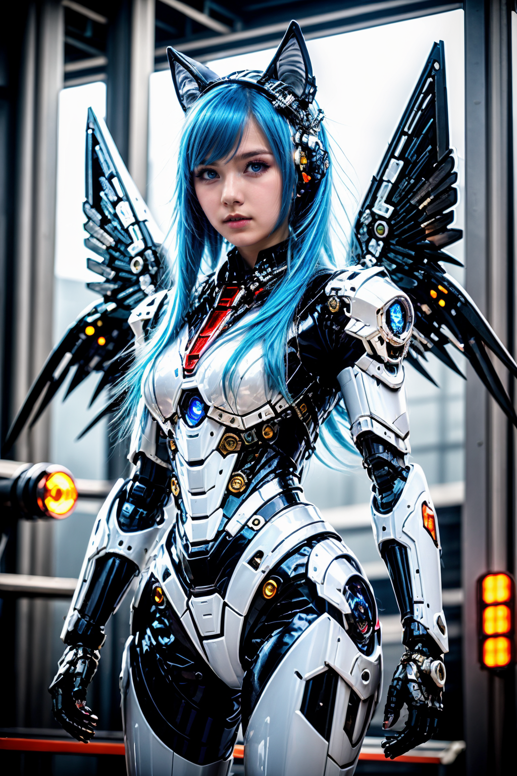 <lora:AgainCyberpunkArmor:0.8>,18 y.o, cuite face, 1girl, long hair, solo, blue hair, blue eyes, portrait, very long hair, looking at viewer, standing, animal ears, breasts, mechanical arms, science fiction, cyborg, necktie, chibi, wings,