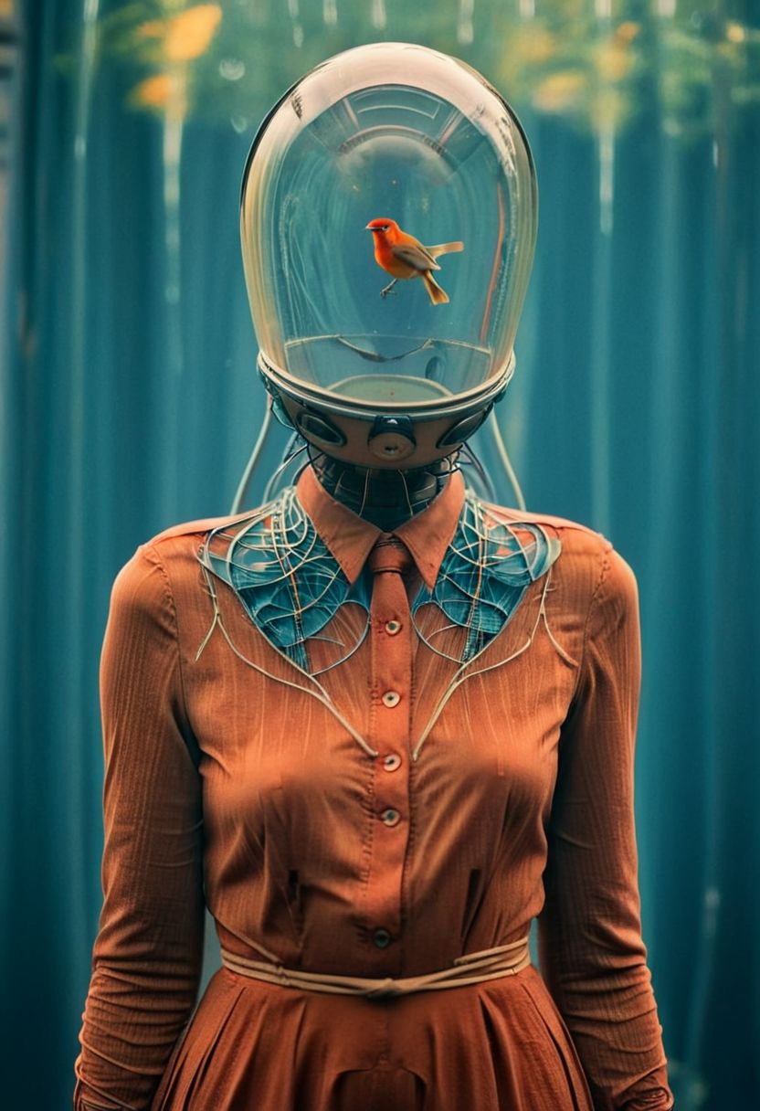 Create an image of an female Slender translucent dark-red skinned female, Long billowing dress Made of cables and hoses, standing at a corner, peeking out curiously. It is wearing a vintage suit with a hat and tie. The colors of the image should be vibrant dark-blue water, giving it a vintage look. The background is a downtown area on a sunny morning, with birds visible in the scene. volumetric lighting, atmospheric haze, Film grain, cinematic film still, shallow depth of field, highly detailed, high budget, cinemascope, moody, epic, OverallDetail, gorgeous, 2000s vintage RAW photo, photorealistic, candid camera, color graded cinematic, atmospheric lighting, skin pores, imperfections, natural, shallow dof,
