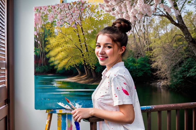 (RAW photo, subject, 8k uhd, dslr, soft lighting, high quality, film grain, Fujifilm XT3, masterpiece, best quality, extremely detailed photograph, volumatic light, ray tracing, bust shot , extremely detailed 8k wallpaper), beautiful young german (paint splash) women, tanned skin color, delicate face, delicate eyes, very long dark haoir, bun, buns, pink lips, (paint splattered 1.4) short white clothes, navel free, sit on chair, painting beautiful landscape trees flowers river house blue sky on canvas, dark room, indirect light, smile, hdr spring day