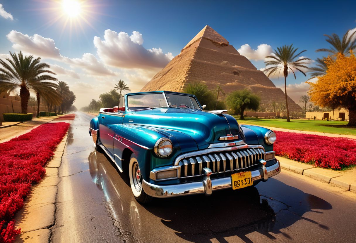 cinematic photo of 1952 Chevrolet Convertible, magnificent three pyramids of Giza appear clearly, charm, highly detailed car, Professional lighting, full of life, Lively and energetic, 8K, rays of sun flow beyond heavy clouds, HDR, Fast & Furious movie, motion blur, moving tires, Cinematic Shot, Cinematic Lighting, amazing world, pure perfection, Need For Speed, wide angle exterior background, wet asphalt road, autumn leaves, grass, flowers, jasmine flowers, palm trees, nebula horizon.