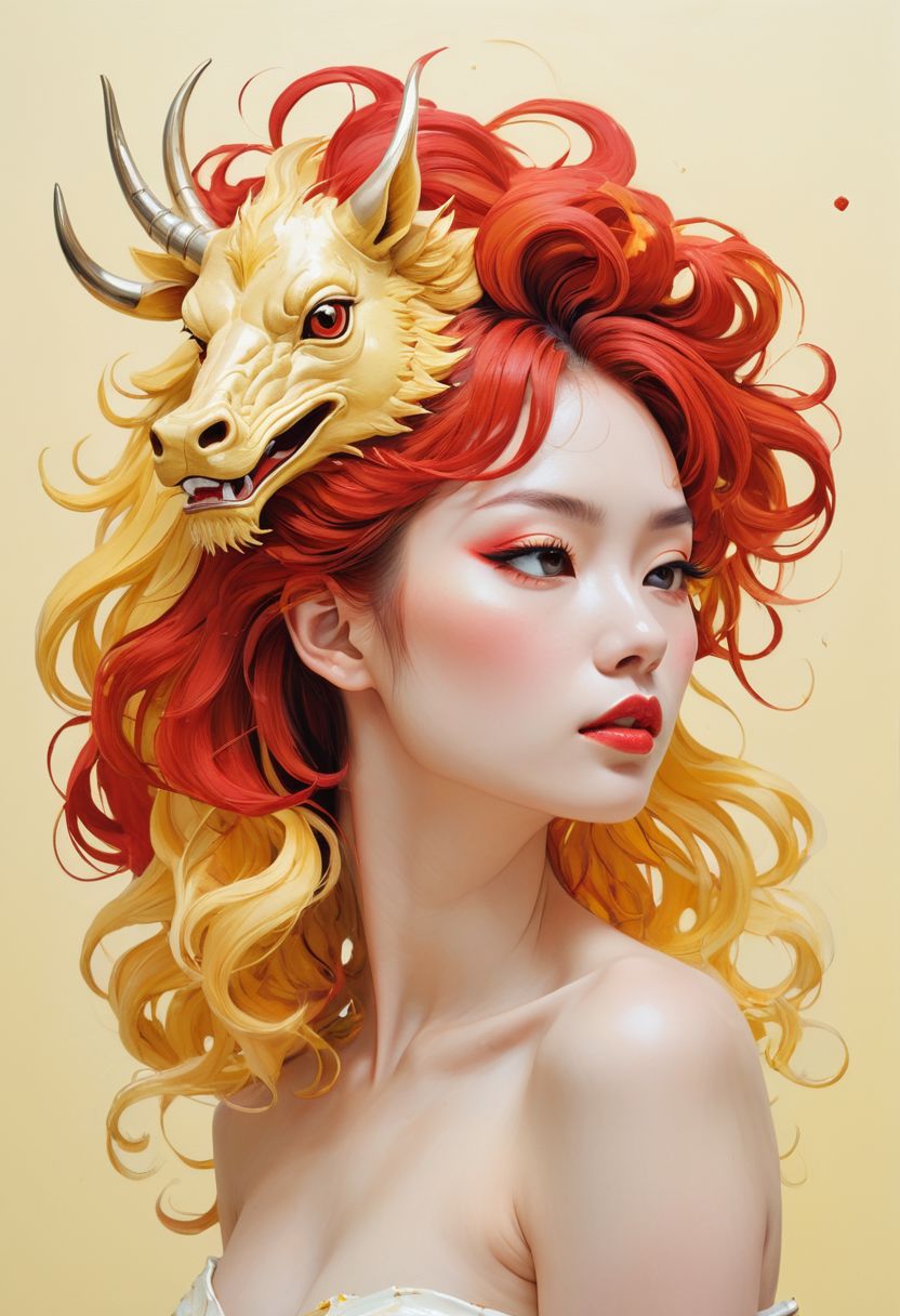 fine art, 35mm camera, beautiful photorealistic pale yellow red and golden kirin, daydreaming, impasto, playful and imaginative abstract art, pop surrealism, inspired by Conrad Roset. Analog Color Theme, retrospective, flat, 2.5D