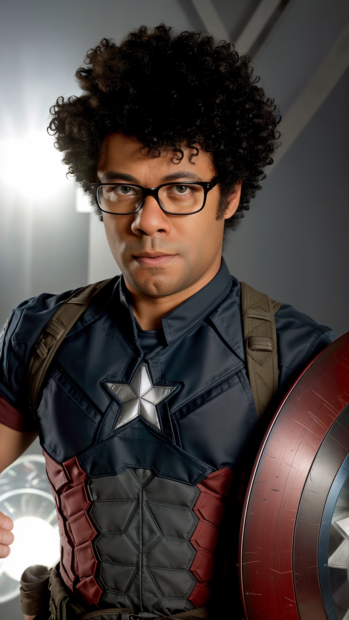 modelshoot style, muscular (Richard Ayoade as Moss), as (Captain America), intricate details, lens flare, intricate detailed face, 4k, 8k, hdr <lora:Richard-Ayoade-v10:0.7>
