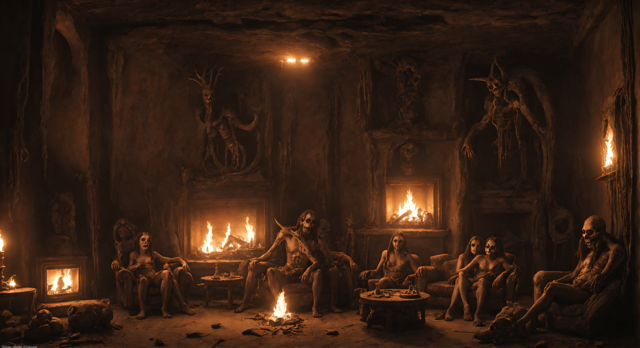 ((Masterpiece)), ((Best Quality))RAW photo, subject, 8k uhd, dslr, soft lighting, high quality, film grain, Fujifilm XT3, In the heart of the infernal realm lies a living room unlike any other, a nightmarish yet oddly charming space. The walls, alive with flames, glow in an eternal blaze, their surfaces cracked and oozing molten lava that cascades down in fiery rivulets. The air is thick with the scent of brimstone and the faint whisper of ancient, dark incantations.The floor is a mosaic of jagged stones, interspersed with demonic runes that pulse with a sinister red light, casting eerie shadows across the room. Strewn about are various body parts of demons, some petrified in grotesque forms, others still twitching as if yearning to reunite with their original hosts. Skulls and bones are artfully arranged on shelves, serving as macabre decorations and reminders of the roomâs otherworldly nature.In stark contrast to the hellish decor, the centerpiece of this infernal abode is a plush, velvet sofa, deep crimson in color and surprisingly inviting. Seated comfortably on the sofa are two adorable demons, their small, horned devil like figures a peculiar blend of menacing and endearing. Their eyes, glowing with a mischievous gleam, are fixed on a large, archaic television screen that flickers with scenes of chaos and destructionâan entertainment of choice in this underworld sanctuary.The TV, a relic of arcane technology, rests on a stand made from entwined bones and sinew, exuding an aura of dark magic. As the film plays, the demons giggle and whisper to each other, their voices a melodic counterpoint to the roaring flames and dripping lava. They appear utterly at ease, savoring their leisure in this hellish yet strangely cozy living room.Despite the roomâs terrifying elements, there is an undeniable sense of home for these two cute demons. It is a place where they can relax and enjoy their favorite pastimes, a paradoxical blend of horror and comfort in the depths of the abyss