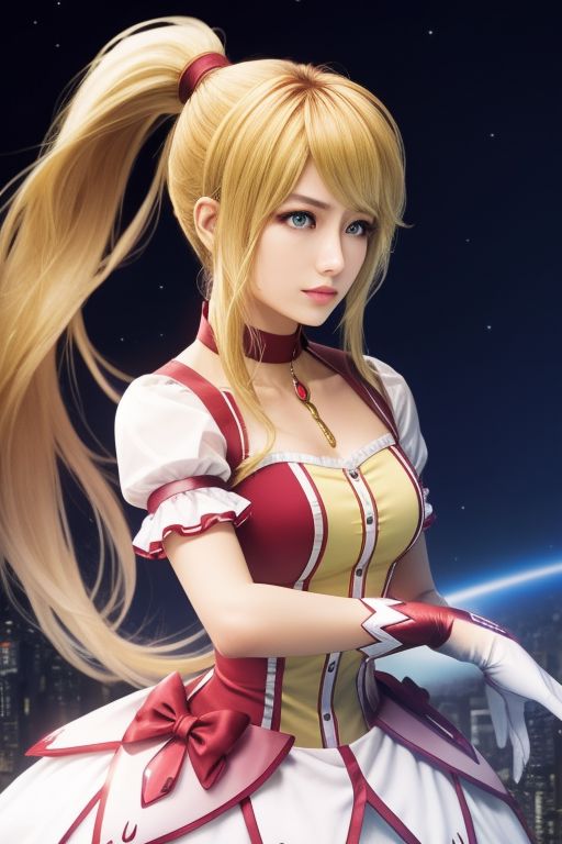 (samus aran) dressed in (kanamemadokaoutfit), (ponytail, hair tie), magical girl, masterpiece, best quality, (perfect face, beautiful face, symmetric face)