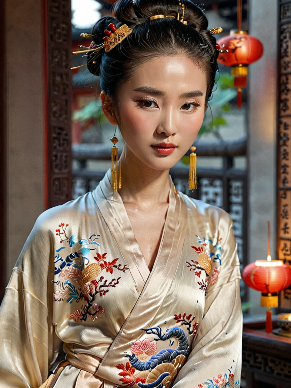 XCYP Oriental Beauty, elegant, serene, traditional Chinese attire, flowing silk robes, intricate embroidery, graceful pose, delicate facial features, serene expression, dark hair styled in an elaborate updo, soft lighting, detailed background, high resolution, 8K, ultra realistic, photorealistic, rich cultural elements, artistic, tranquil atmosphere, classic beauty, refined aesthetics, harmonious composition <lora:é²å䏿´¾@䏿¹åç人åXL:0.8>