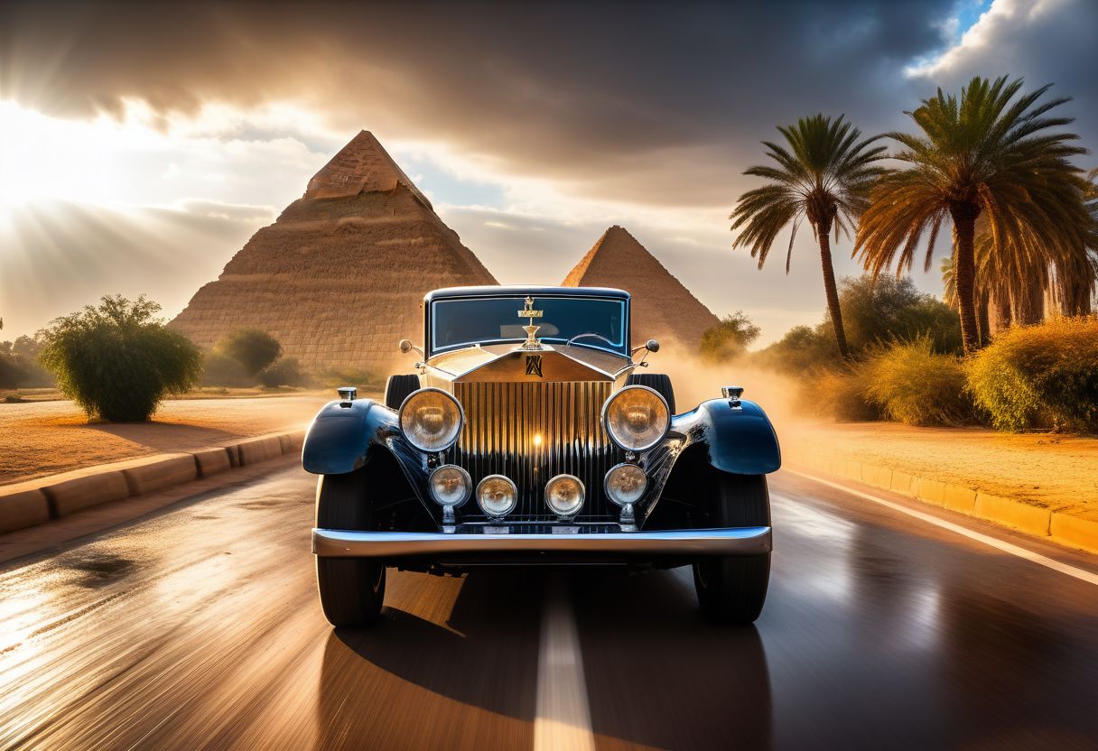 cinematic photo of Rolls-Royce Phantom II 1930, magnificent three pyramids of Giza appear clearly, charm, highly detailed car, Professional lighting, full of life, Lively and energetic, 8K, rays of sun flow beyond heavy clouds, HDR, Fast & Furious movie, motion blur, moving tires, Cinematic Shot, Cinematic Lighting, amazing world, pure perfection, Need For Speed, wide angle exterior background, wet asphalt road, autumn leaves, grass, flowers, jasmine flowers, palm trees, nebula horizon.